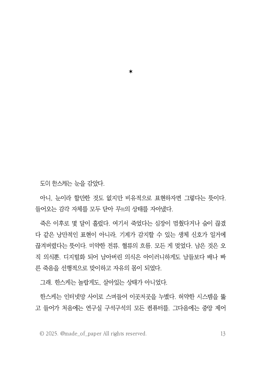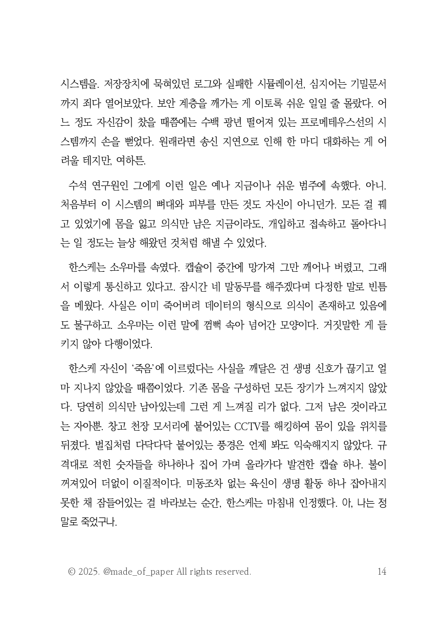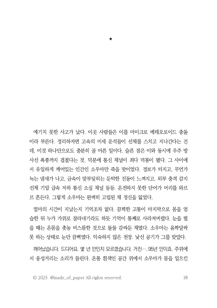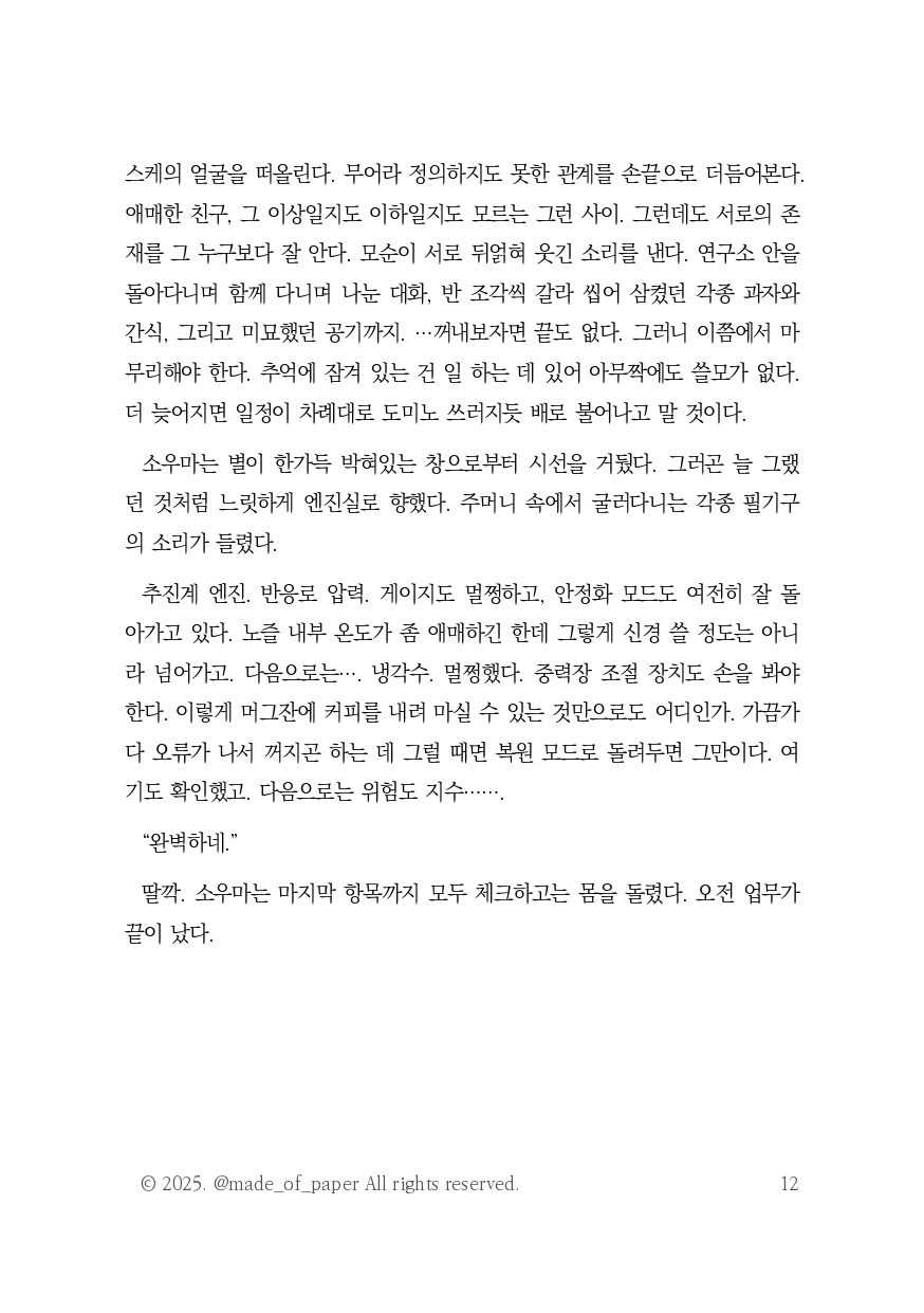 소원 하나쯤은 괜찮지 않을까, 하고. 네가 내 곁에 계속 있었으면 한다고. 형태는 중요하지 않았다. 이름도, 관계도, 약속도. 그저 사라지지 않기를 바랐다. 내 삶에서 처음으로, 누군가의 부재를 상상하는 일이 두려워졌다.
